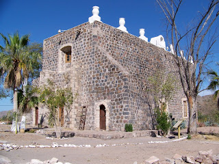 Very hilly country through here and not much more than Cardons...until of course we get to Mulege. It is an oasis of green. The Rosalita river runs through the town out to the sea and creates a jungle of palms. Having had a hurricane just three years ago, the water from the river virtually wiped out everything in its path taking many buildings in the valley. Not deterring anything, a fancy resort popped up right in the flood zone with litter from the hurricane still visible all around. Visited the mission which was built in the 1700s. So cool inside you'd think it had air conditioning. Large ex-pat community here and they have helped the community bringing in a couple of fire trucks, an ambulance and helping the schools. Picked up breakfast at the town center fish taco stand (Ed said not as good as the one he found in La Paz) and lunched at Dunnys. Picked up some fresh groceries and took a taxi back to Playa Santispac.
